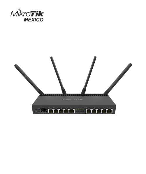 El RB4011iGS+5HacQ2HnD-IN (modelo WiFi) es de doble banda, unidad de cuatro cadenas con un rango de 1733 Mbps en 5GHz. Para dispositivos heredados, la unidad también cuenta con una tarjeta inalámbrica de 2.4 Ghz de doble cadena, y un puerto miniPCI-e-